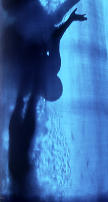 Das Bild einer Frau im purpurfarbenen Gewand scheint in einer senkrecht hängenden Stahlwanne zu schweben (los). Dabei wirkt der Körper dem kühlen Material zunächst untergeordnet, denn er ist nur schwach zu erkennen - jedoch, im richtigen Blickwinkel, macht eine auftauchende vertikale Lichtsäule die Gestalt deutlich. Sie läuft mit der Bewegung des Betrachters durch den Körper der Frau.
