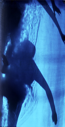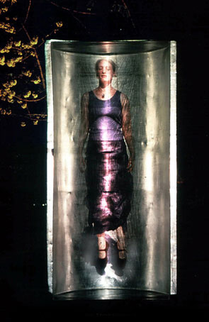 Das Bild einer Frau im purpurfarbenen Gewand scheint in einer senkrecht hängenden Stahlwanne zu schweben (los). Dabei wirkt der Körper dem kühlen Material zunächst untergeordnet, denn er ist nur schwach zu erkennen - jedoch, im richtigen Blickwinkel, macht eine auftauchende vertikale Lichtsäule die Gestalt deutlich. Sie läuft mit der Bewegung des Betrachters durch den Körper der Frau.
